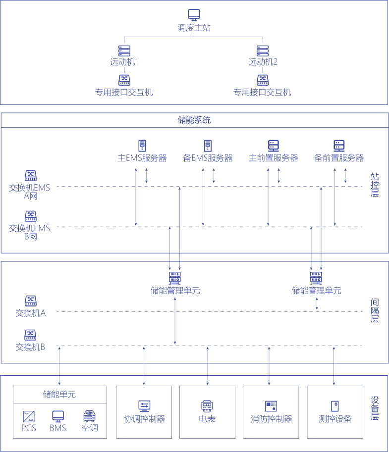 储能EMS能量管理系统具备实时监控、数据采集、数据处理、系统监视、设备模型管理、事件顺序记录(SOE)、事件及报警处理、遥控遥调/能量调度AGVC/一次调频、储能运行策略等功能。系统支持多种工业实时以太网协议、工业总线协议以及电力行业通讯协议,包括IEC104、IEC61850等;具备云边协同能力和边缘智能数据处理能力,具有完备的安全特性;具备灵活组网方案,覆盖多种储能站类型。
