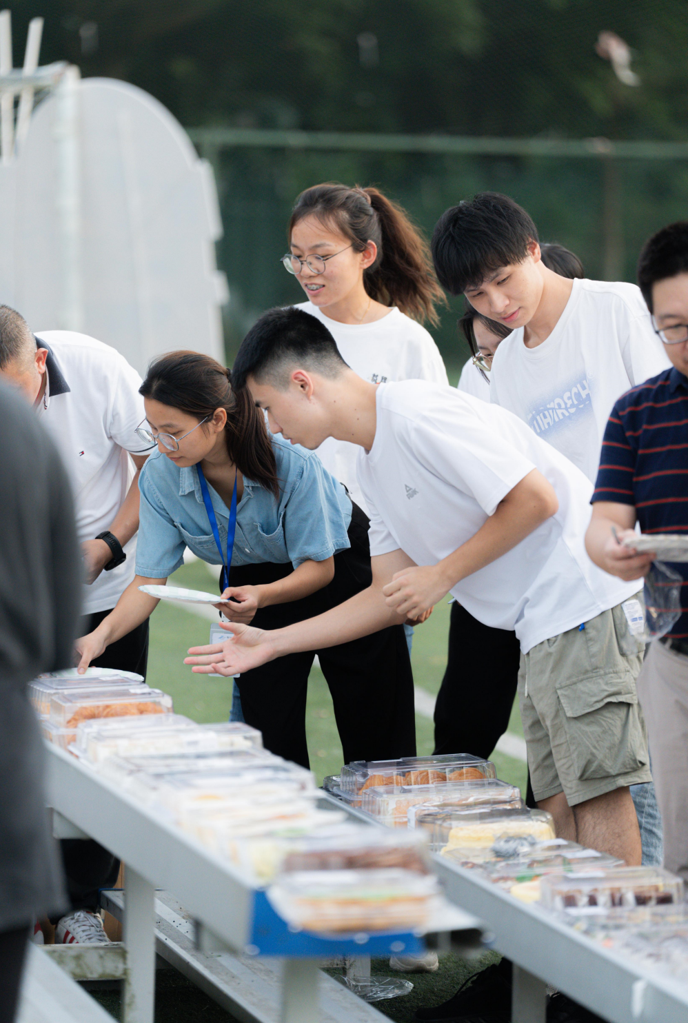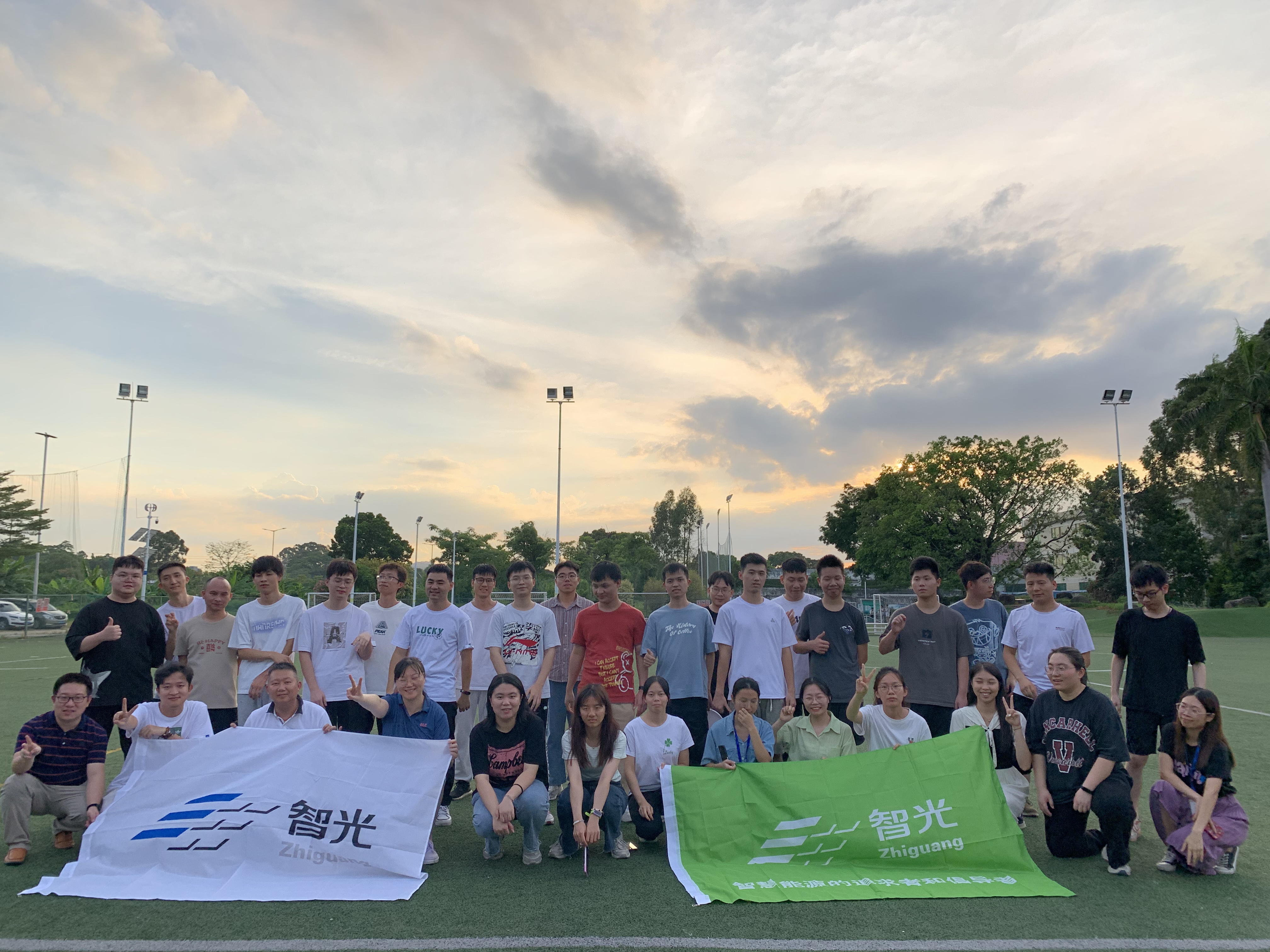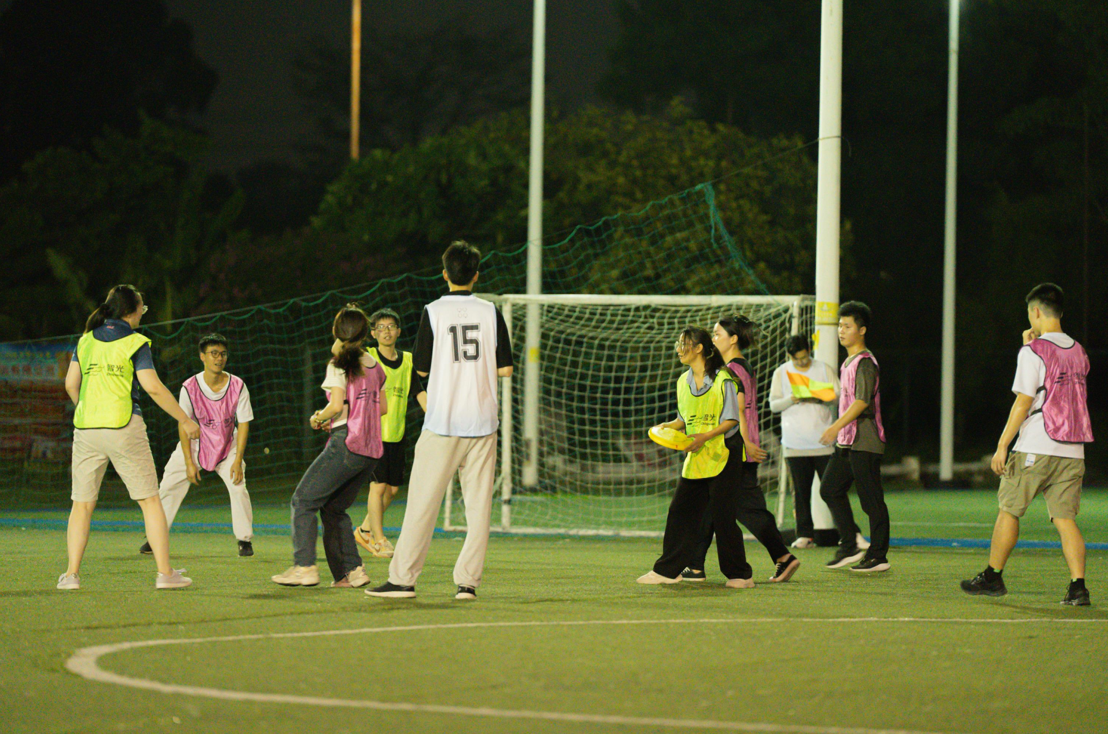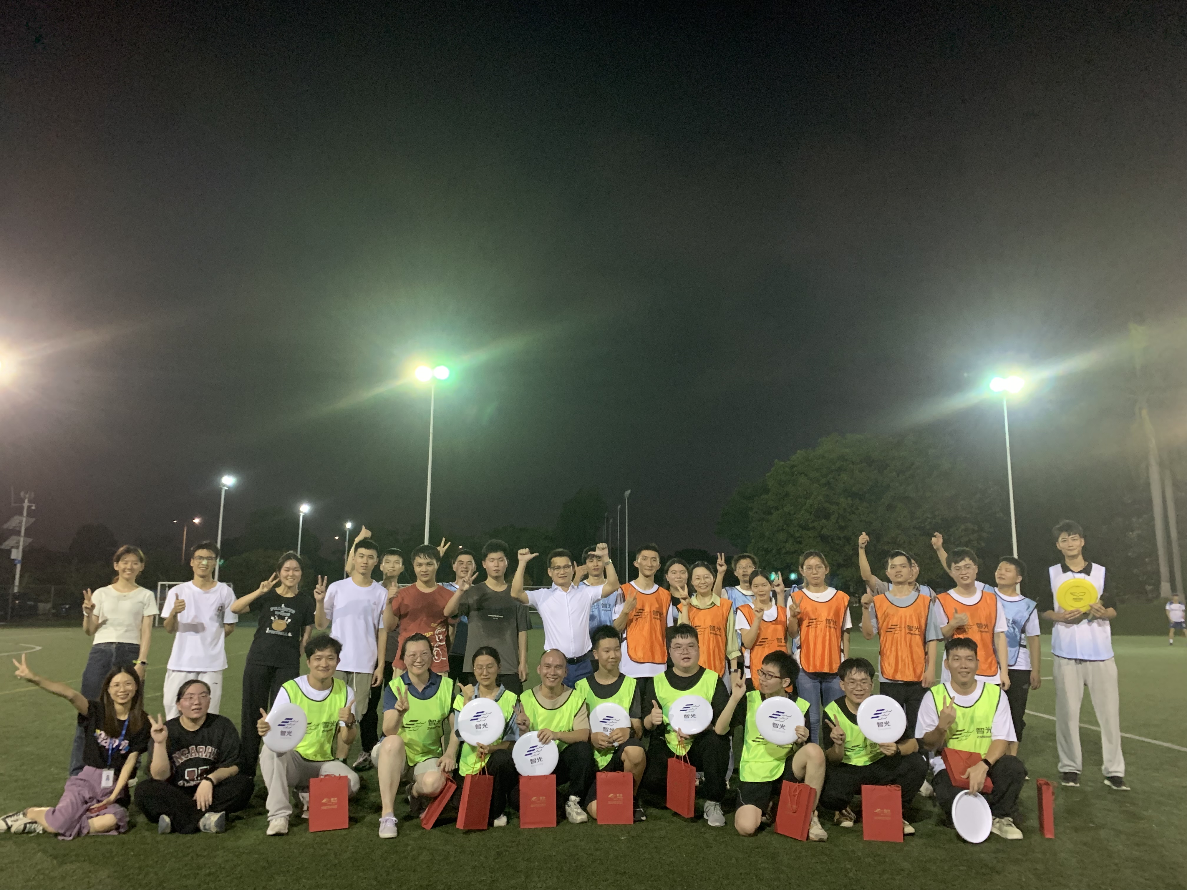 飞盘活动开始前,在教练的引导下,大家开始舒展腰身、活动筋骨,为畅享飞盘运动做好充分的准备。在明确比赛规则及规范动作后,参与活动的员工们被分为四队,分别为红队、蓝队、绿队及橙队,在教练的指导下进行了激烈而欢乐的比赛。体育场上,飞盘往返的弧线尽情交织,青春的朝气蓬勃焕发,汗水在夕阳下挥洒,每个人都乐在其中。经过激烈角逐,最终绿队斩获冠军。