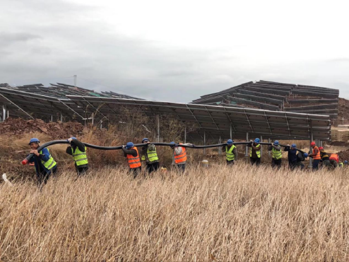 该项目属于山地光伏,地块分散、作业面积大,山地坡度大、地形复杂,大面积粮片、土地性质和产权构成复杂,施工管理和本土关系协调难度都十分艰巨。针对该工程特点,以华跃电力为主体的项目现场管理团队深入开展专题研究,提出了一系列解决方案。
